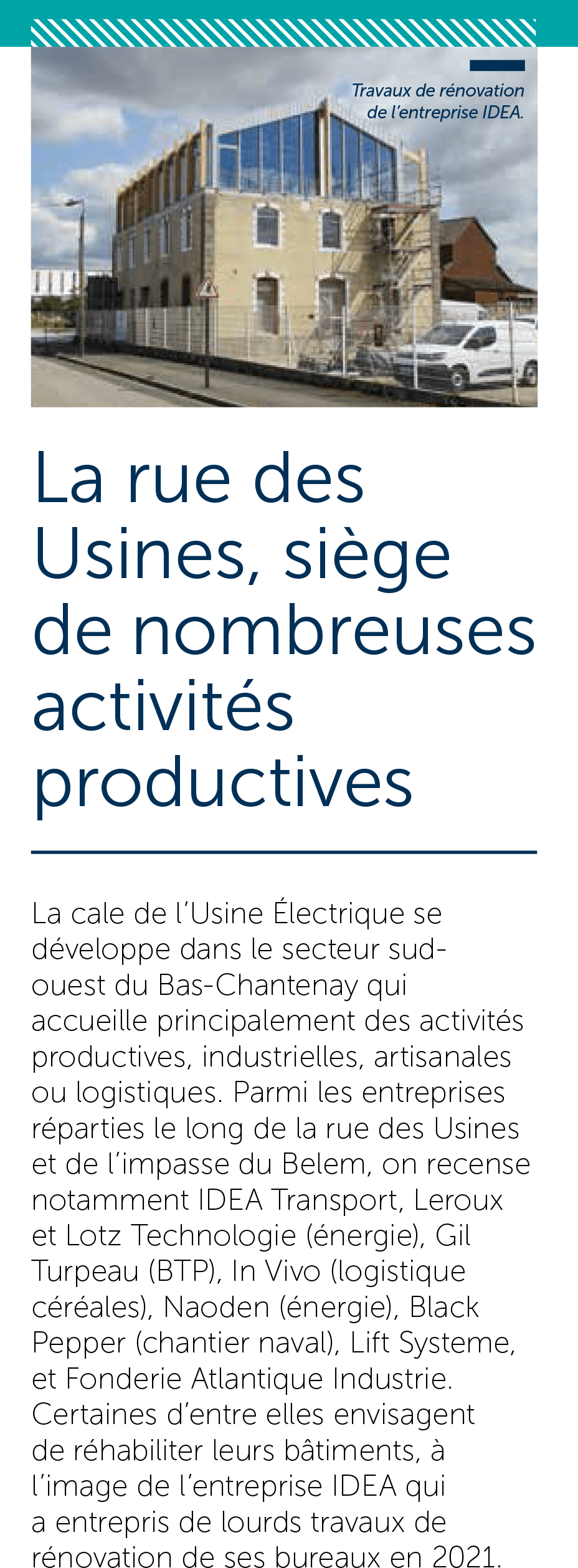 Plusieurs entreprises sont à recenser le long de la Rue des Usines et de l'impasse du Belem : IDEA, LEROUX AND LOTZ, GIL TURPEAU, IN VIVO, NAODEN, BLACK PEPPER, LIFT SYSTEME, FONDERIE ATLANTIQUE INDUSTRIE.